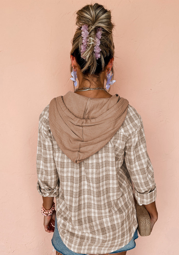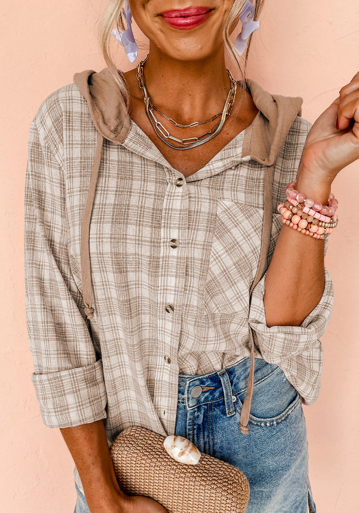 Khaki Checkered Print Loose Fit Buttoned Hooded Shacket