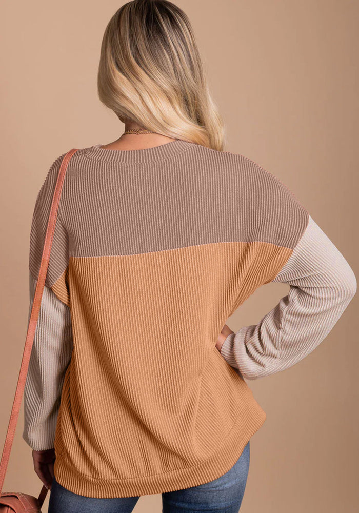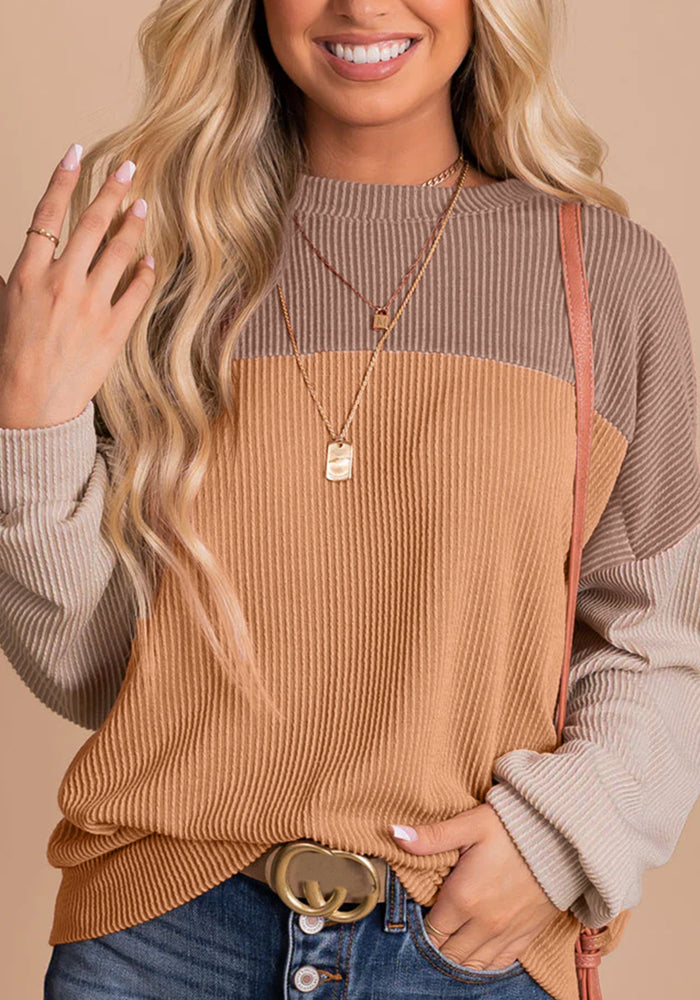 Khaki Color Block Long Sleeve Ribbed Loose Top