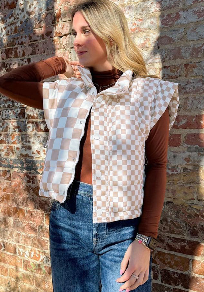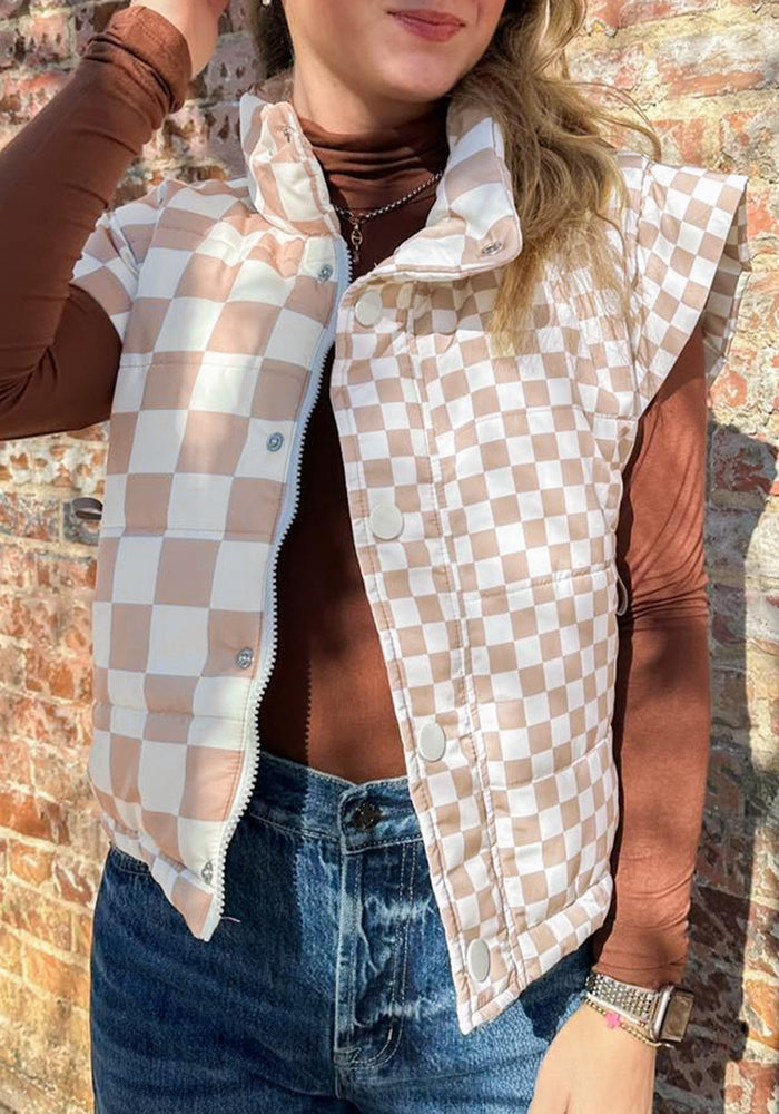 Khaki Contrast Plaid Quilted Button Zip Up Vest
