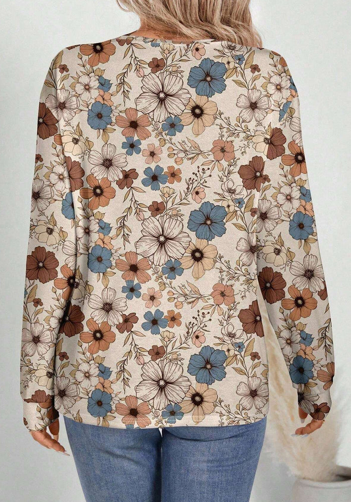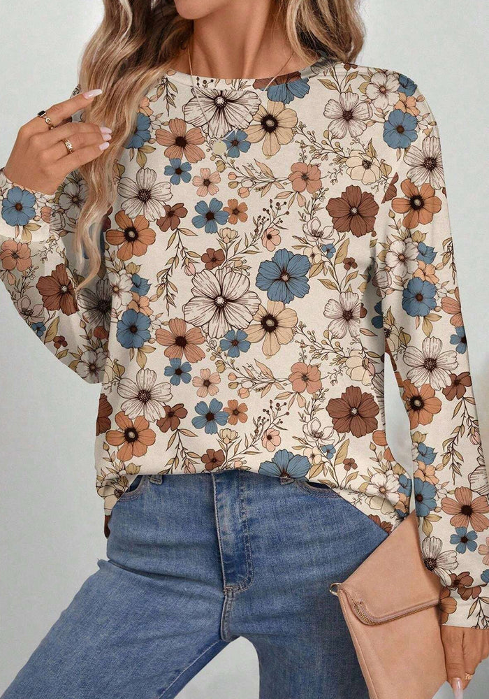 Khaki Floral Print Loose Crew Neck Long Sleeve T Shirt