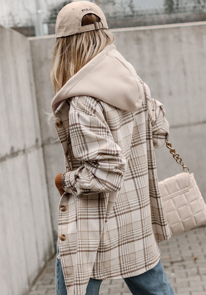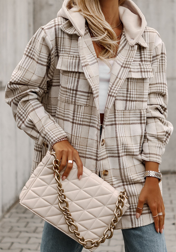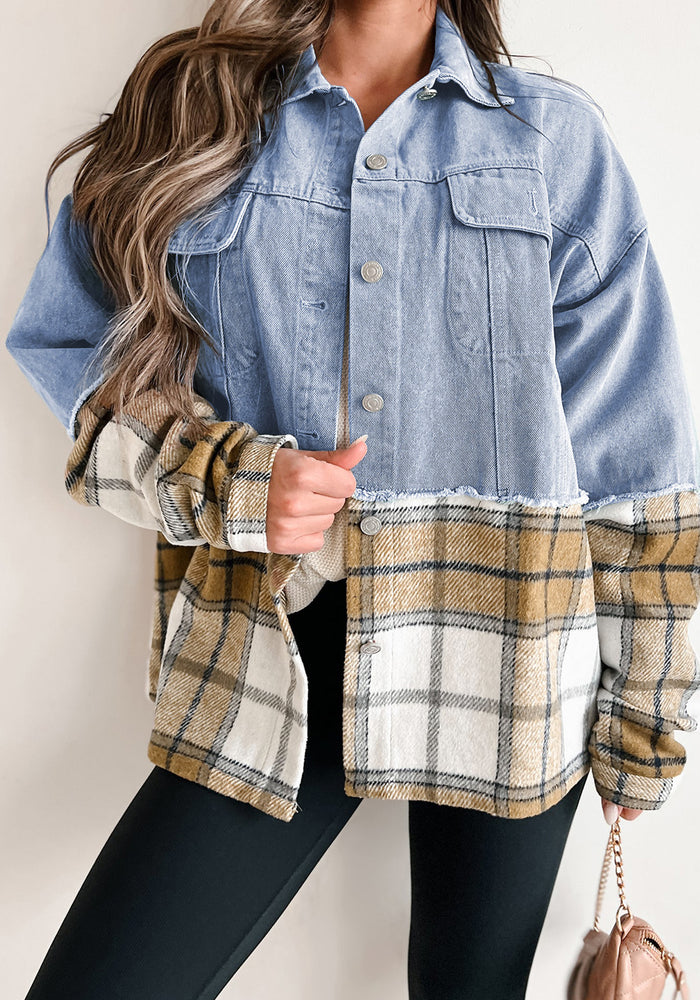 Khaki Plaid Patchwork Buttoned Oversized Denim Jacket