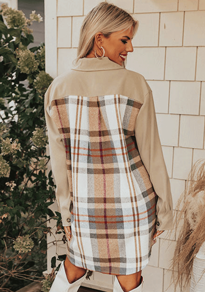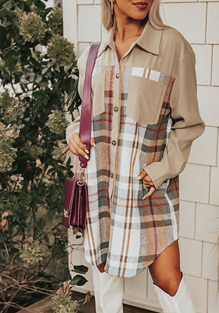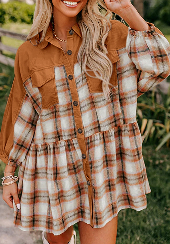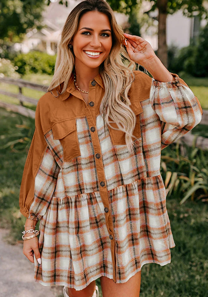 Khaki Plaid Patchwork Long Sleeve Shirt Mini Dress