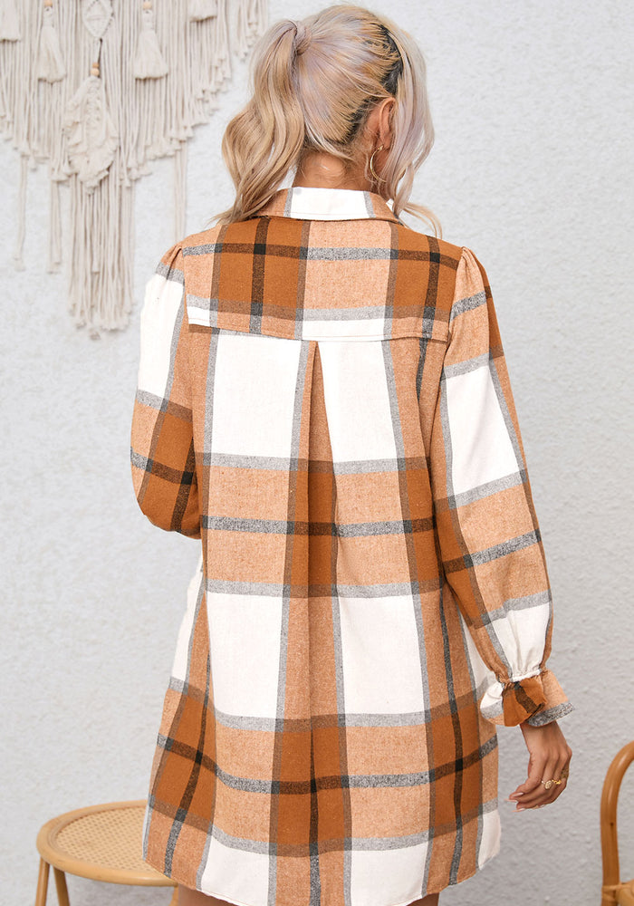 Khaki Plaid Pattern Collared Neck Ruffled Sleeve Shirt Dress