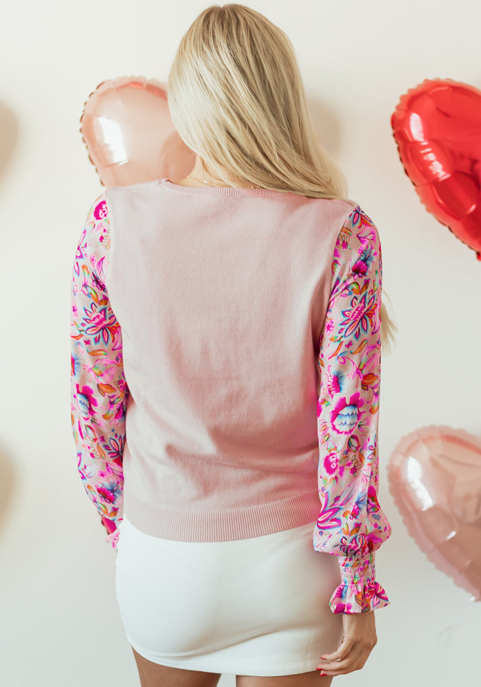 Oatmeal Floral Printed Patchwork Smocked Lantern Sleeve Knit Top