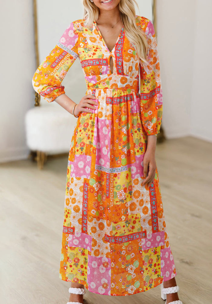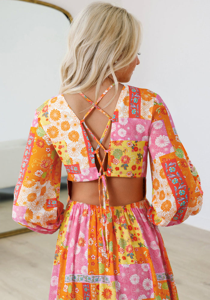 Orange Floral Patchwork Print Cut out Tied Back Bracelet Sleeve Maxi Dress