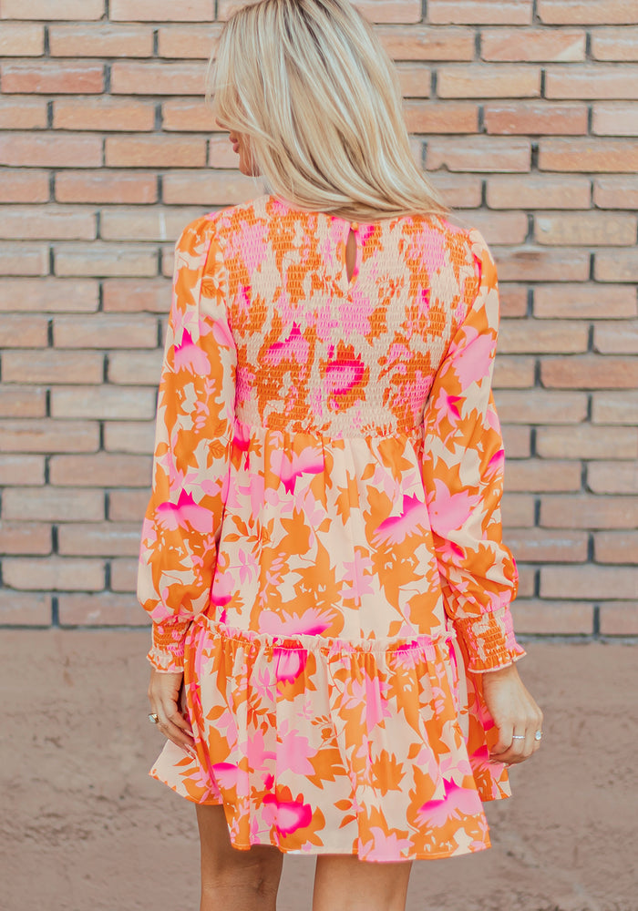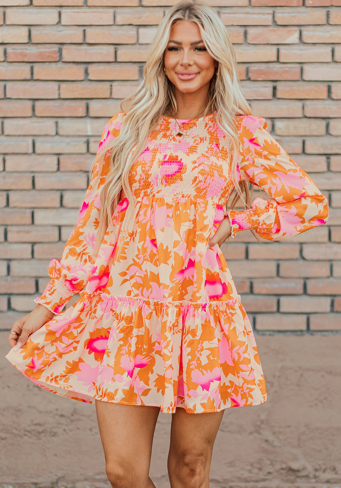 Orange Abstract Print Smocked Lantern Sleeve Ruffle Mini Dress