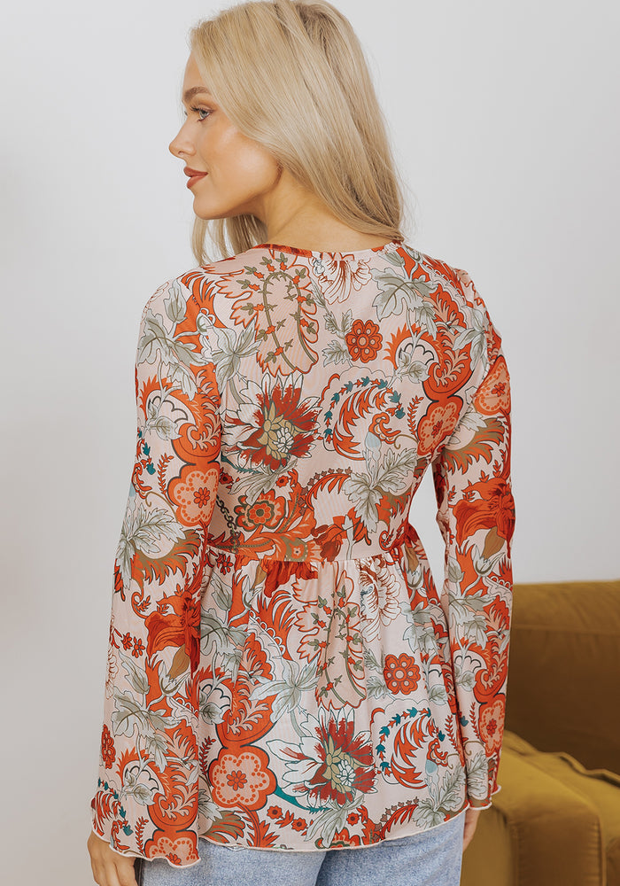 Orange Floral Print Deep V Neck Knot Bell Sleeve Blouse