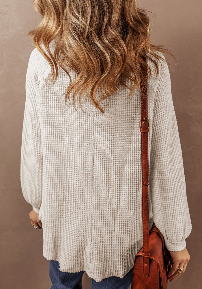 Oatmeal Waffle Knit Buttoned Front Raglan Sleeve Loose Blouse