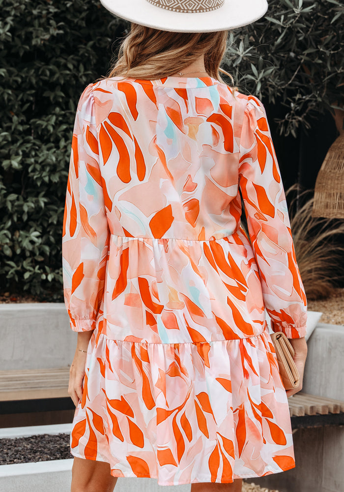 Orange Abstract Print Split Neck Long Sleeve Dress