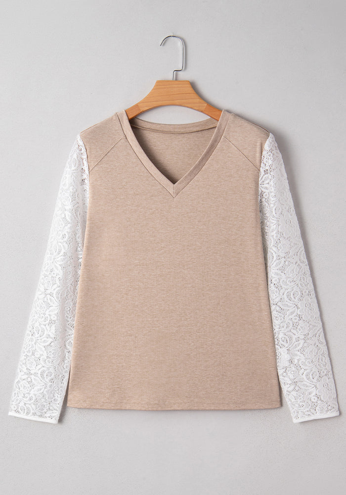 Oatmeal V Neck Contrast Lace Patchwork Long Sleeve Top