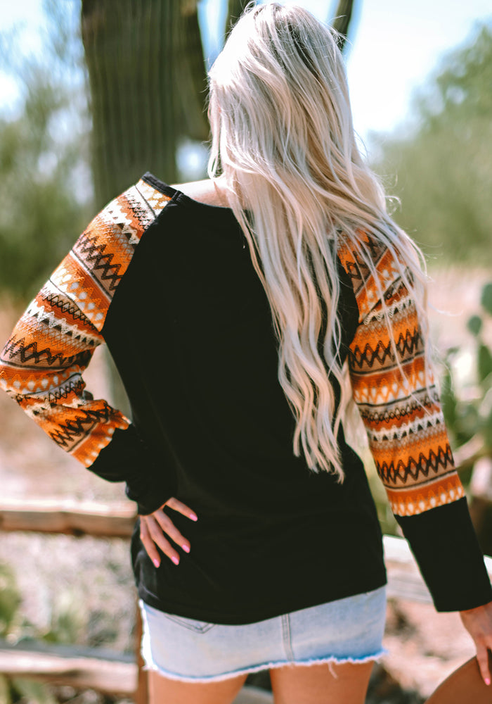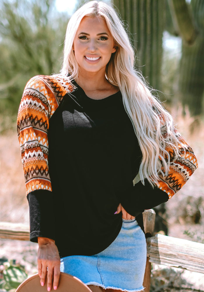 Orange Geo Print Raglan Patchwork Long Sleeve Tee