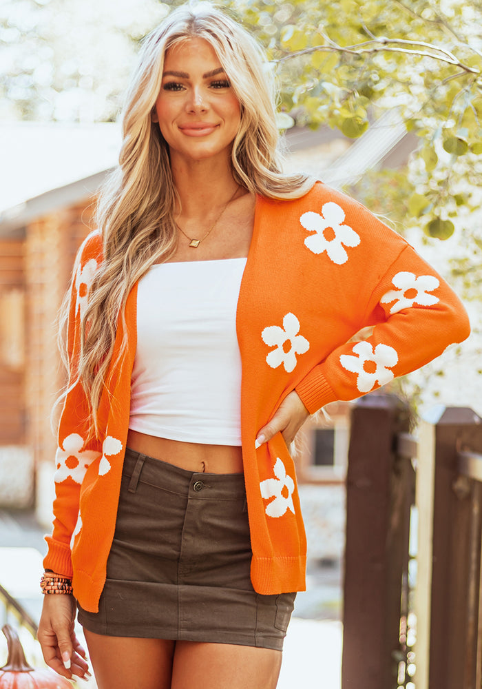 Orange Floral Print Knitted Open Front Loose Cardigan