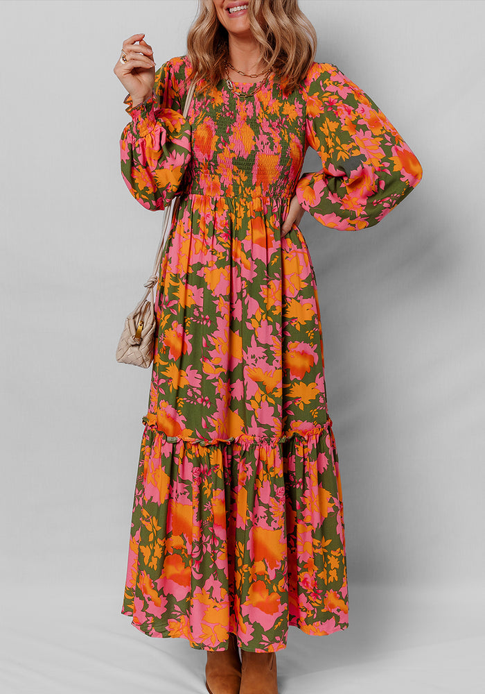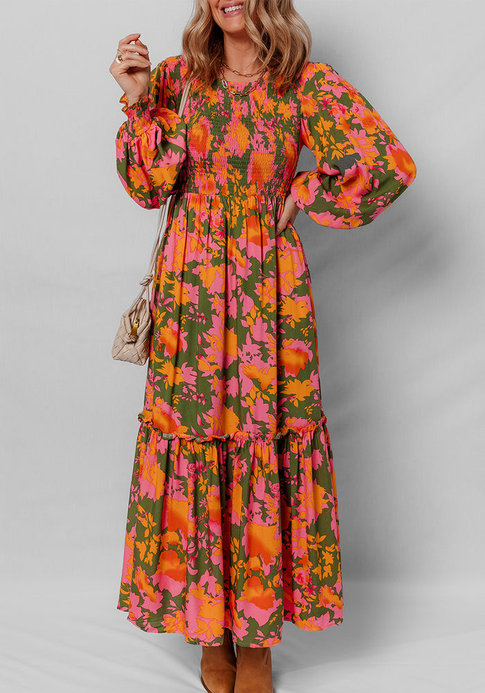 Orange Floral Puff Sleeve Smocked Bodice Ruffled Long Dress