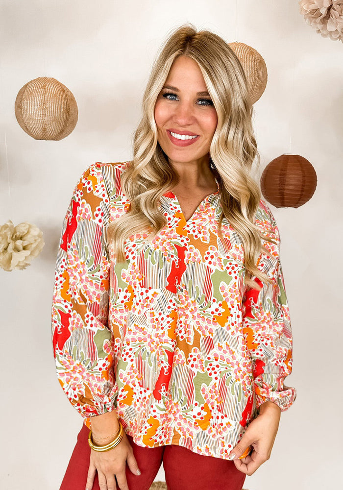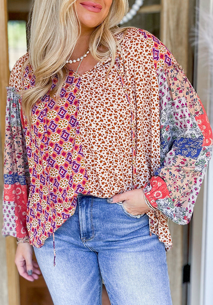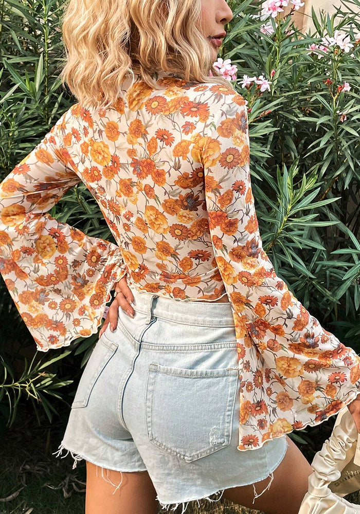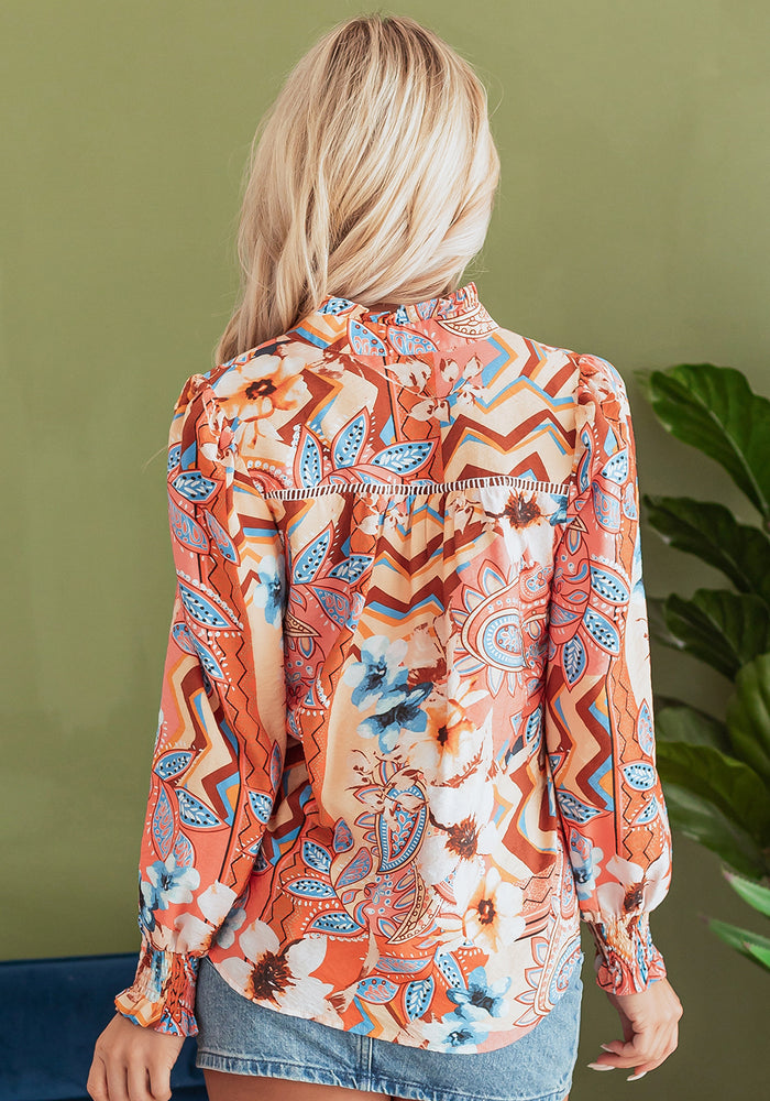 Orange Mixed Floral Printed Long Sleeve Tied V Neck Blouse