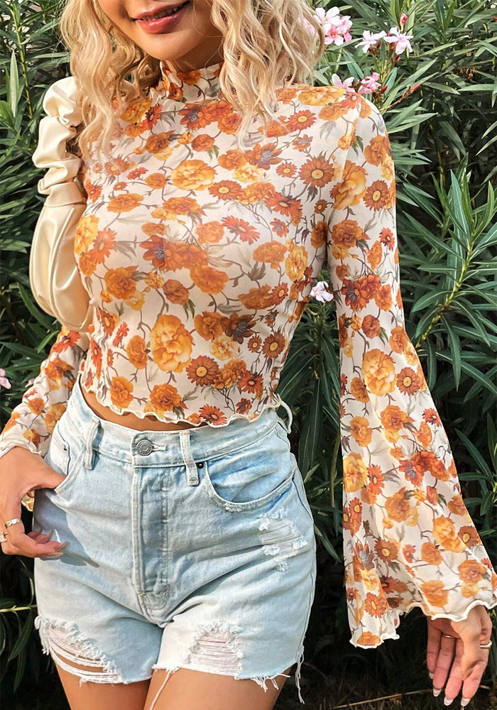 Orange Floral Printed Bell Sleeve Mock Neck Scallop Trim Blouse