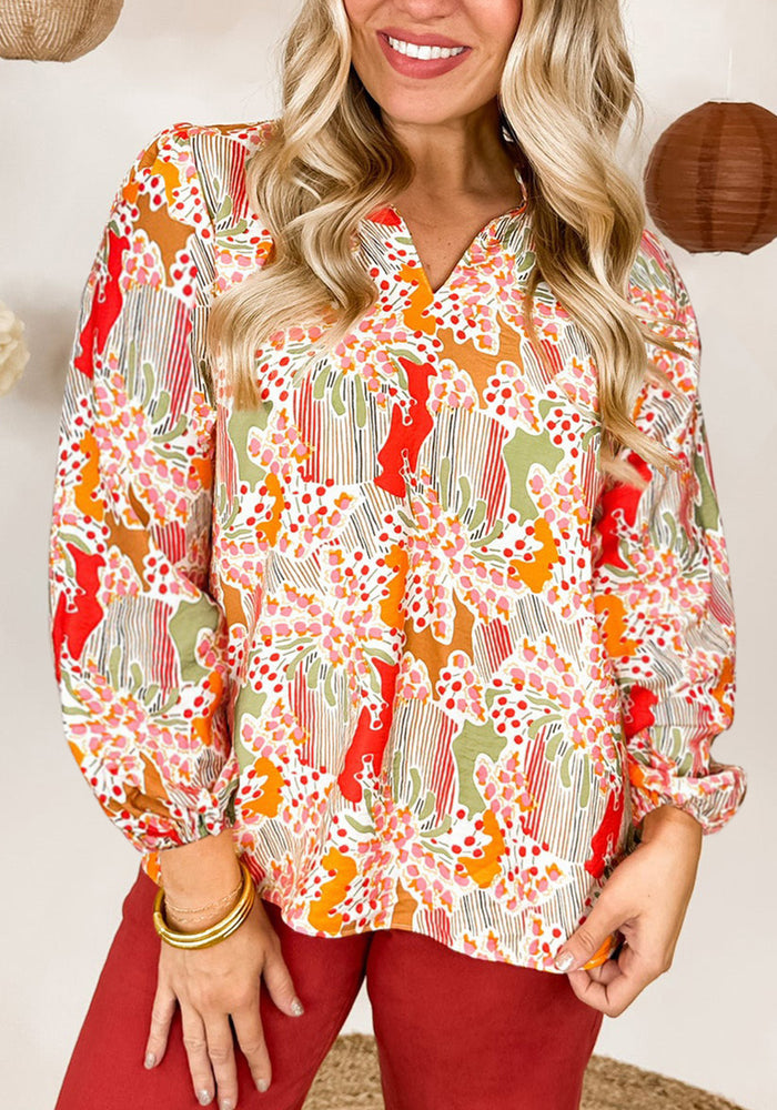 Orange Printed Split V Neck Puff Sleeve Blouse