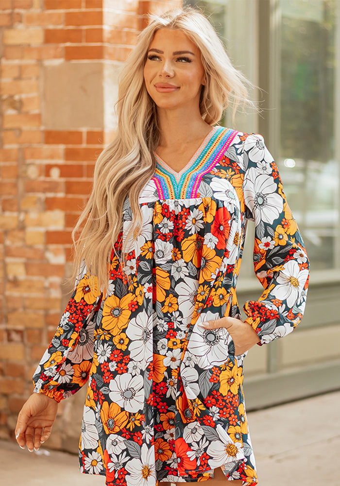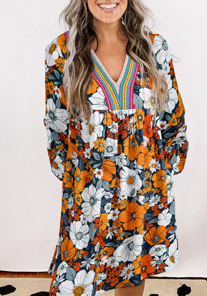 Orange Floral Print Striped Lace V Neck Long Sleeve Mini Dress