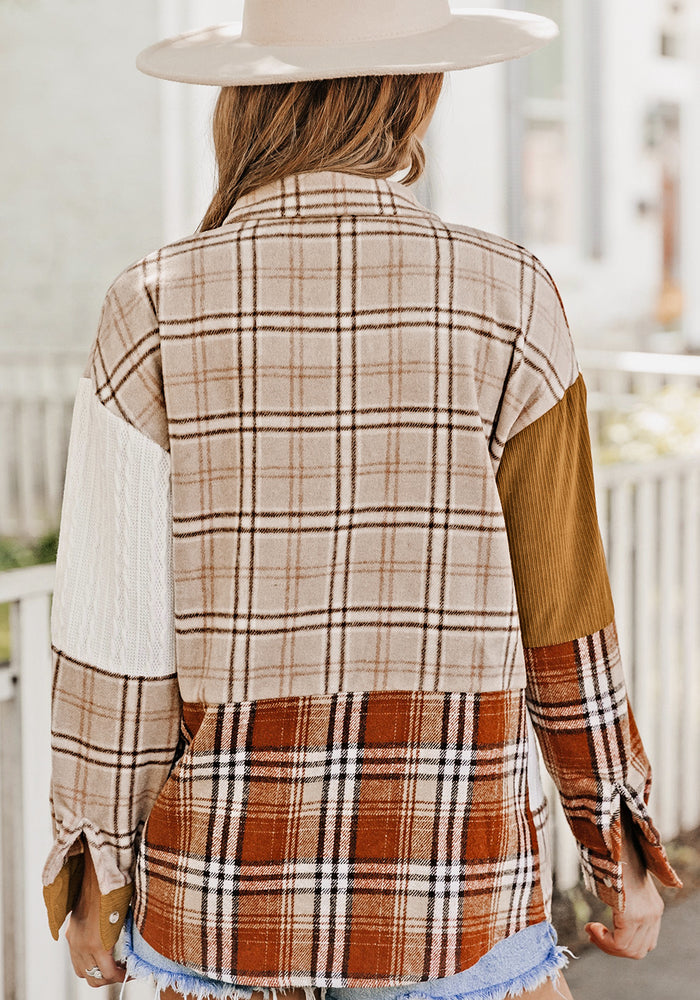 Orange Plaid Color Block Patchwork Shirt Jacket with Pocket