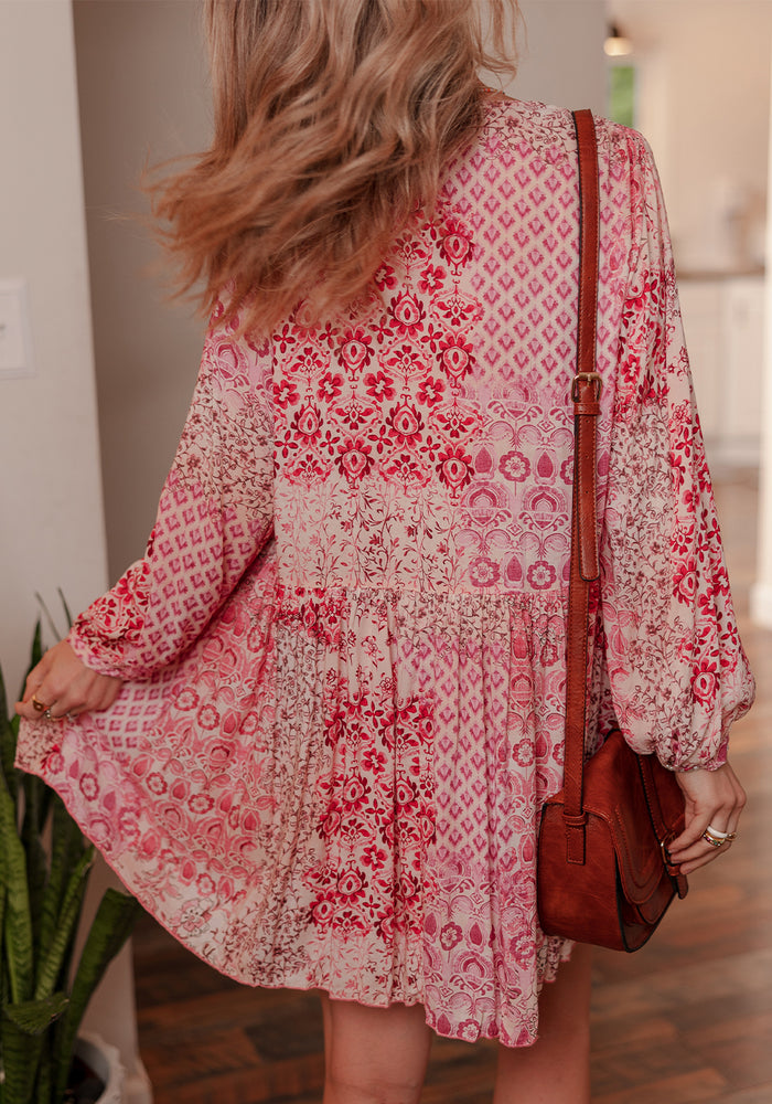 Pink Bohemian Floral Print Tassel Tie Long Sleeve Flowy Mini Dress