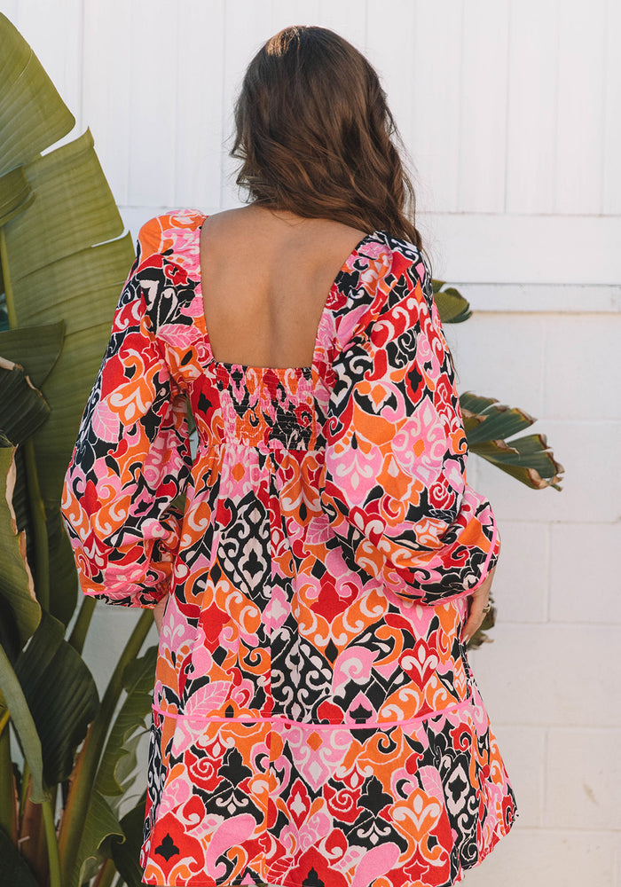 Pink Bohemian Square Neck Puff Sleeve Mini Dress