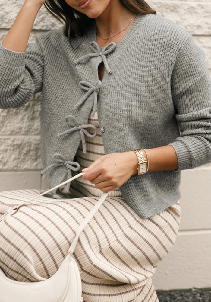 Philippine Gray Ribbed Knit Bow Front Buttoned Cardigan