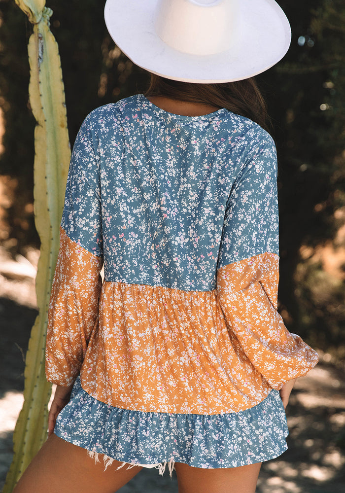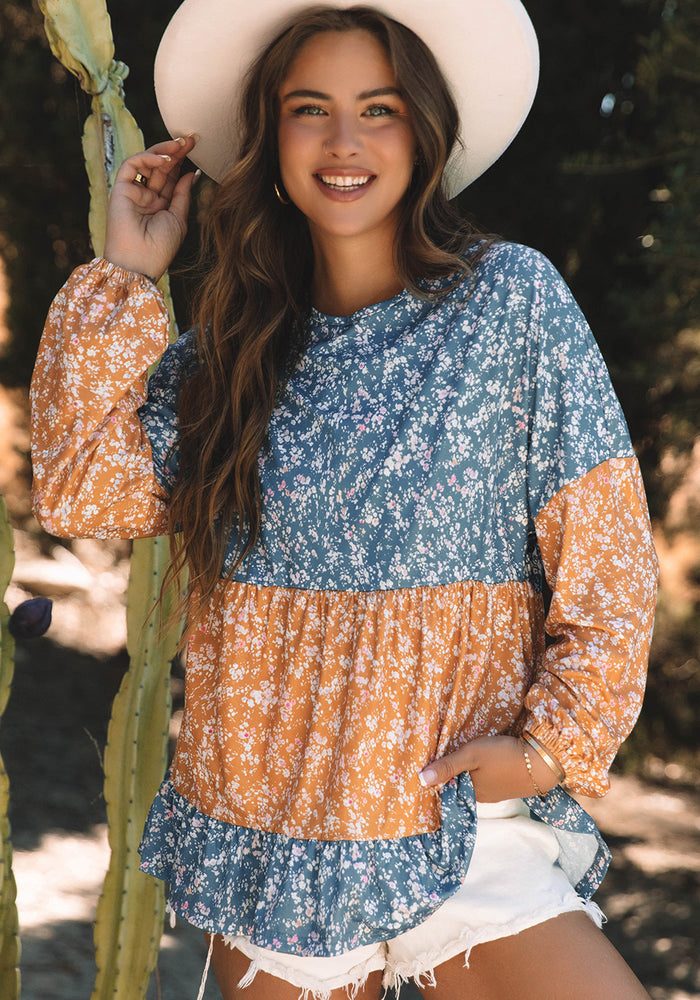 Orange Floral Color Block Patchwork Ruffled Hem Round Neck Blouse