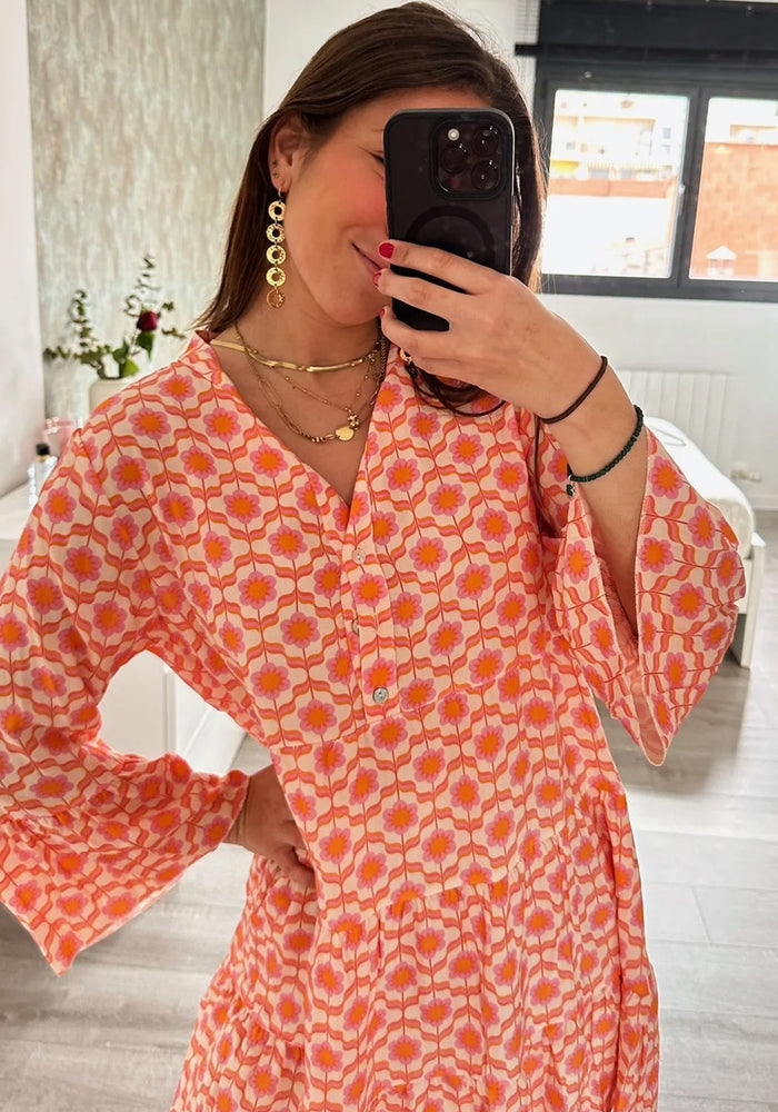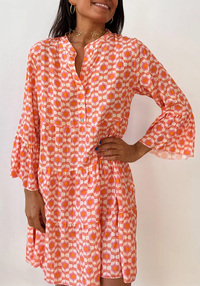 Orange Floral Print Flounce Sleeve Buttoned Front Mini Dress
