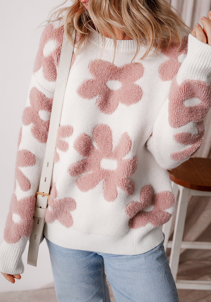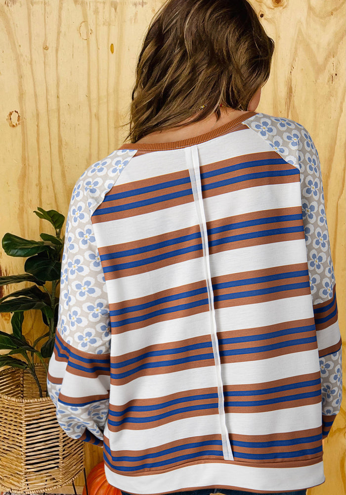 White Striped Floral Printed Patchwork Lantern Sleeve Blouse