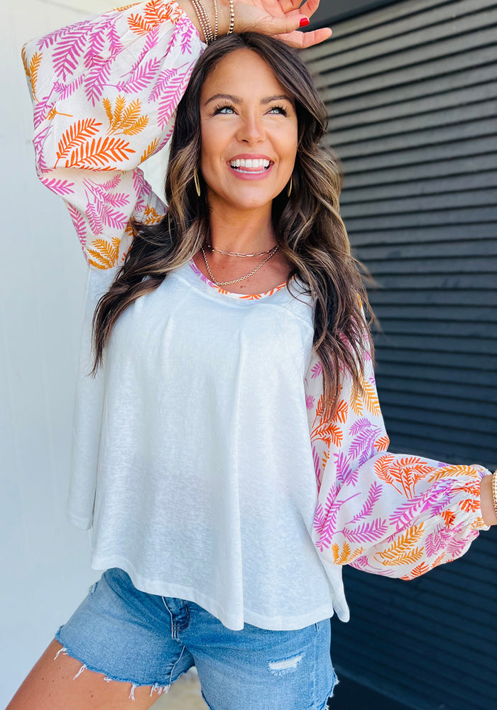 White Tropical Leaf Printed Patchwork Sleeve Round Neck Top