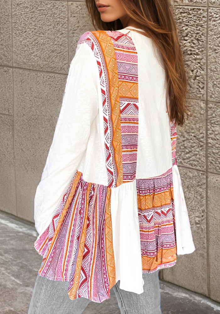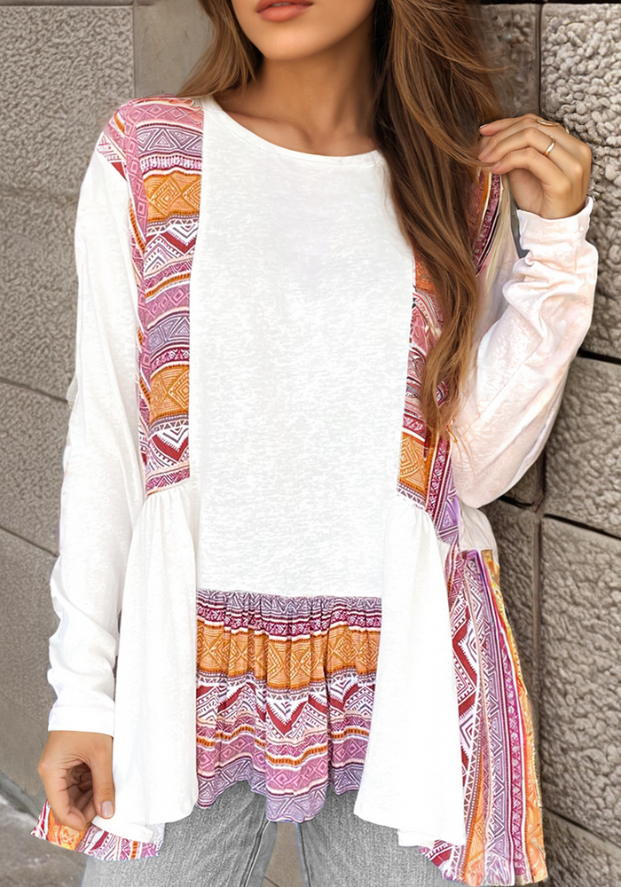 White Western Aztec Print Patchwork Ruffled Tunic Long Sleeve Babydoll Top