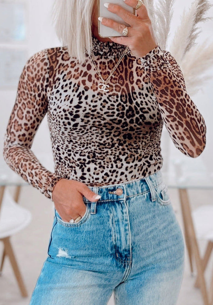 Brown Leopard Smocked Neck Mesh Long Sleeve Bodysuit