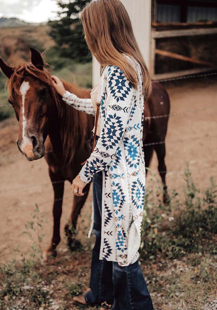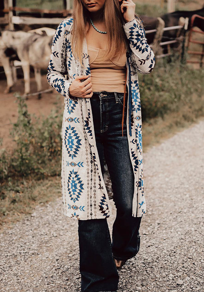 Sky Blue Western Aztec Printed Open Front Long Cardigan