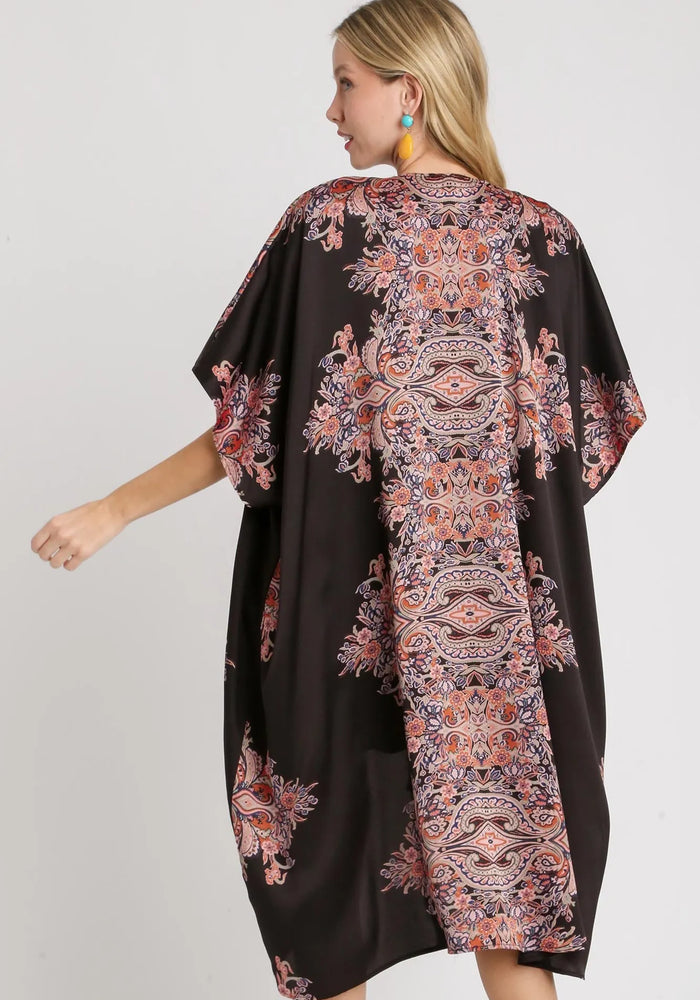 • Umgee Satin Border Print Short Sleeve Open Front Kimono