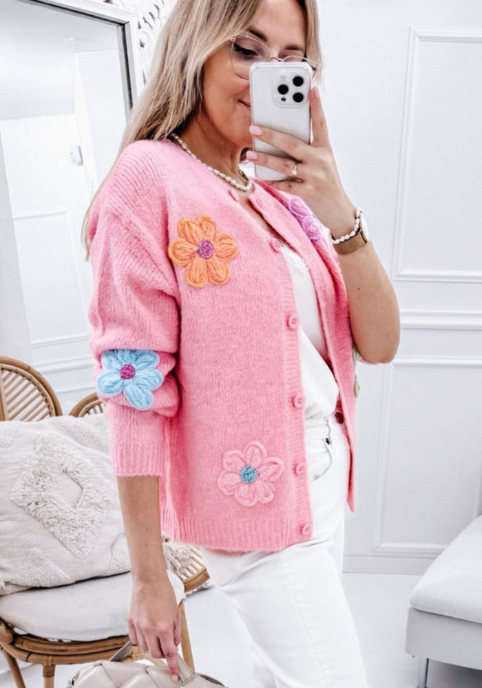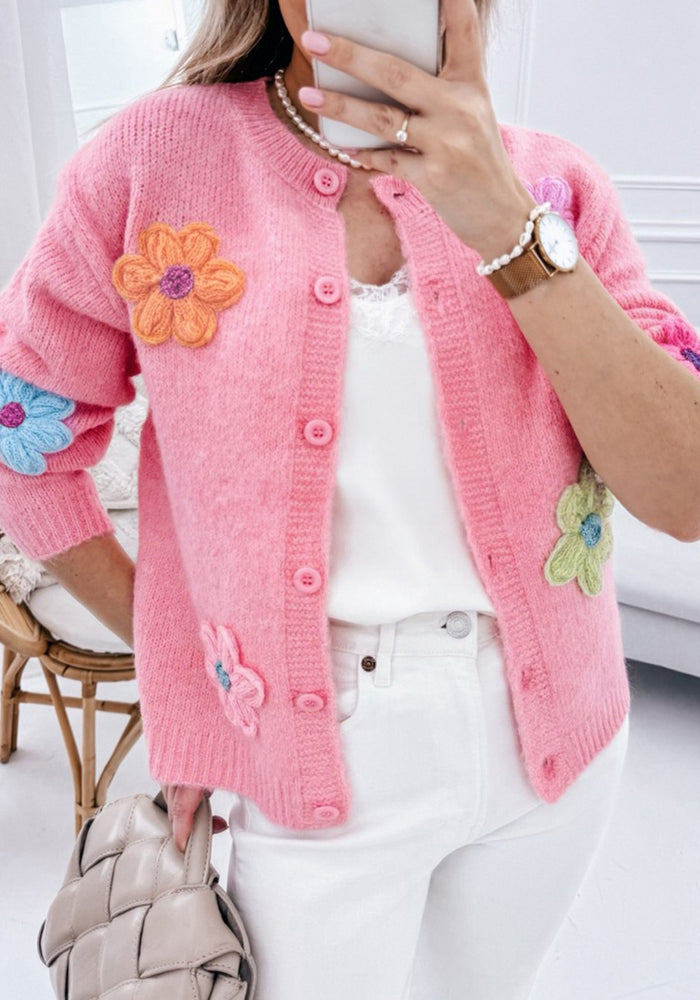 Pink Cute Knitted Floral Pattern Button Up Cardigan
