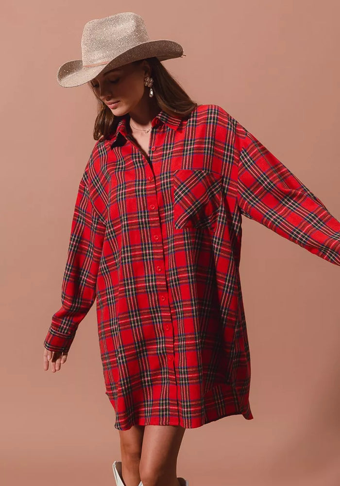 SO ME Christmas Checker Plaid Button Up Shirt Dress