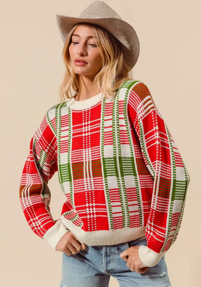 SO ME Christmas Color Checkered Plaid Crew Neck Sweater