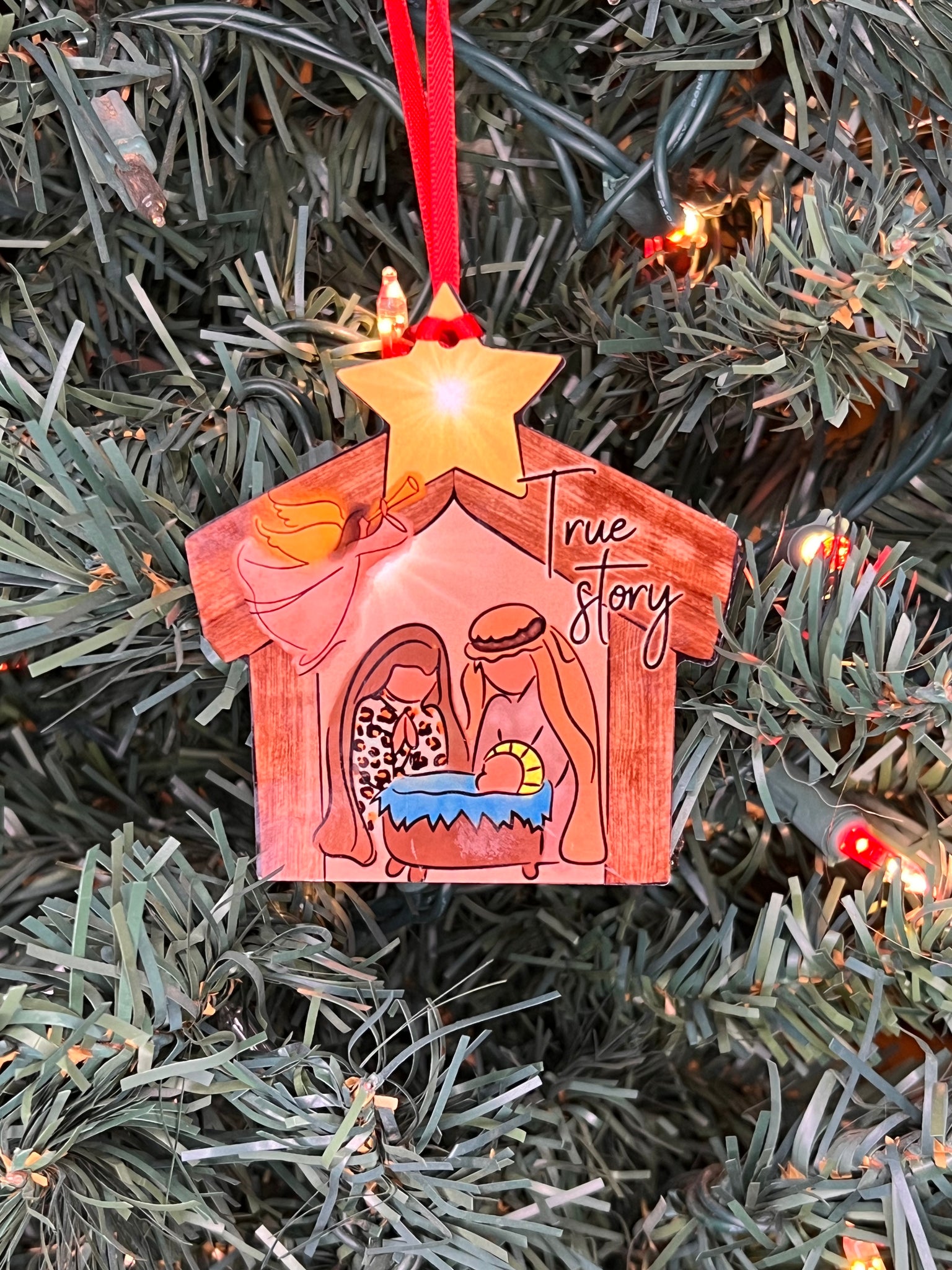 Our True Story Ornament blends modern boutique style with the timeless story of Jesus’ birth. This 3.25” x 3.5” sublimated nativity ornament features warm tones, a modern illustration style, and a trendy leopard-print Mary — perfect for shoppers who love fashionable, faith-centered Christmas décor.