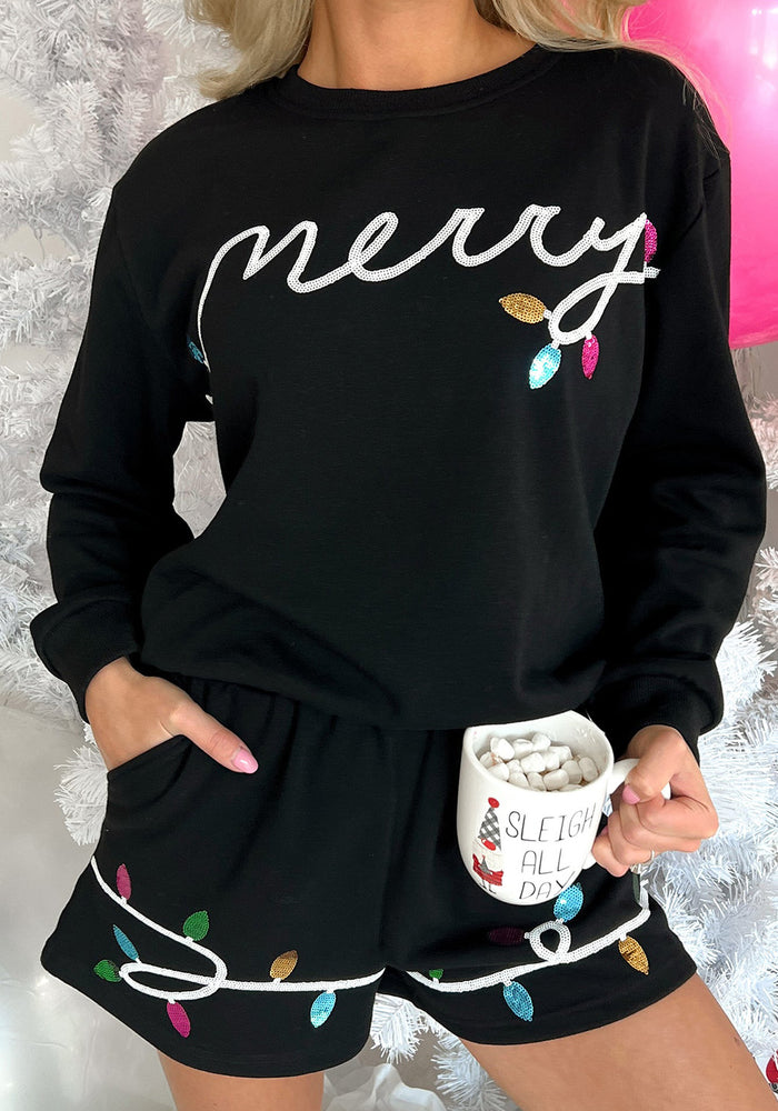 Black Sequin Merry Graphic Pullover and Shorts Outfit