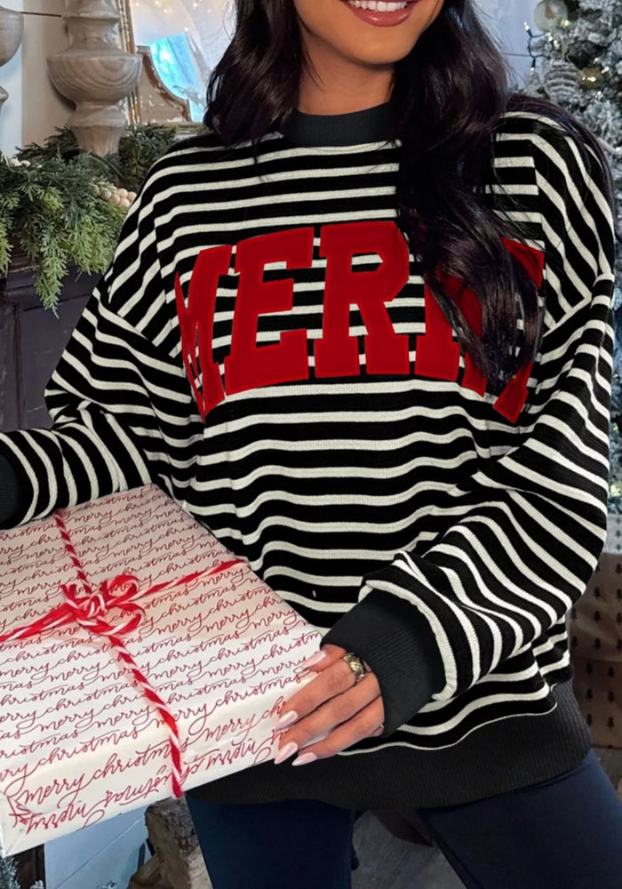 Stripe Contrast MERRY Letter Christmas Print Drop Shoulder Sweatshirt
