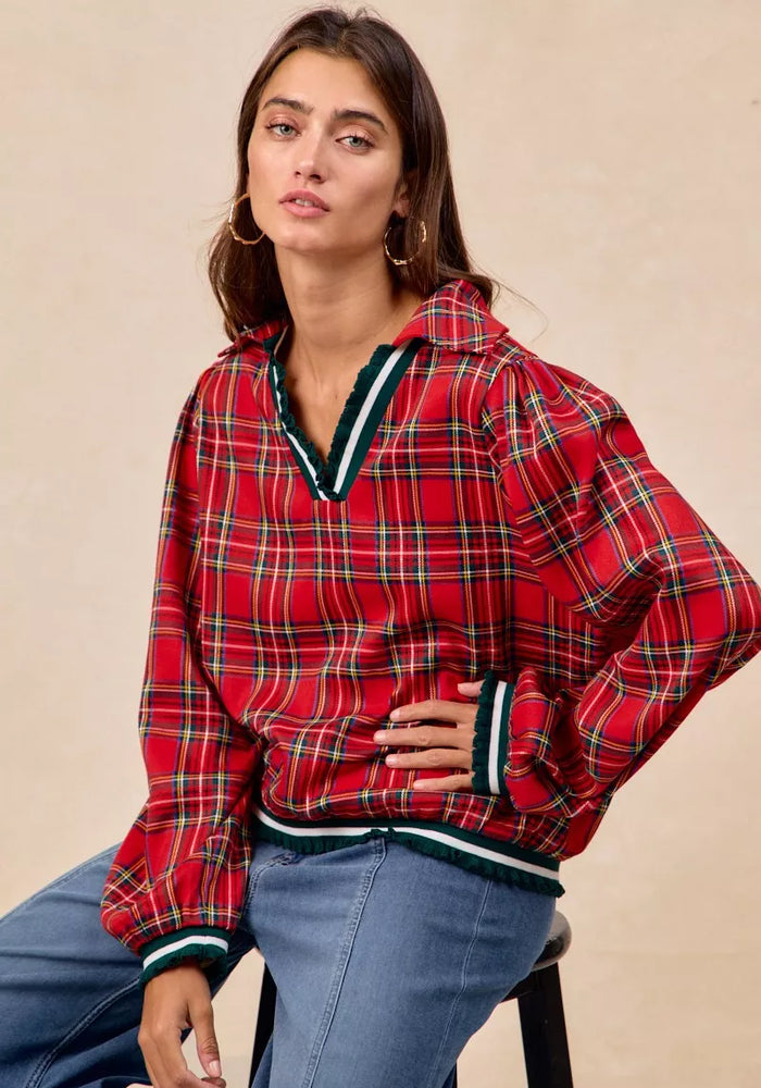 BiBi Christmas Plaid Collared Top with Ruffled Detail