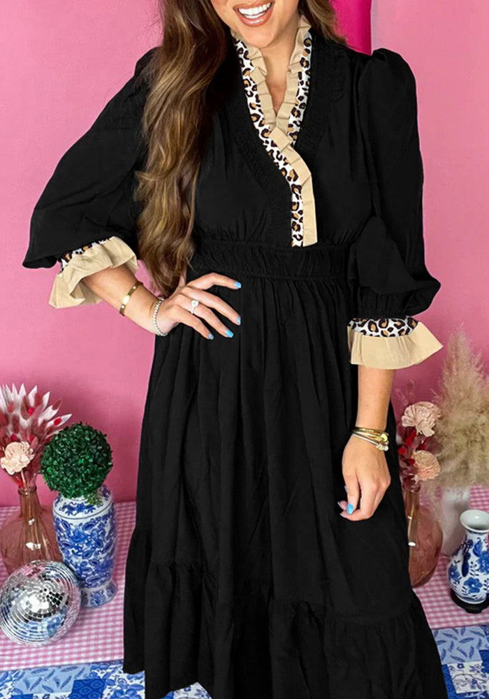 Black Contrast Leopard Frilled Trim V Neck Bracelet Sleeve Midi Dress