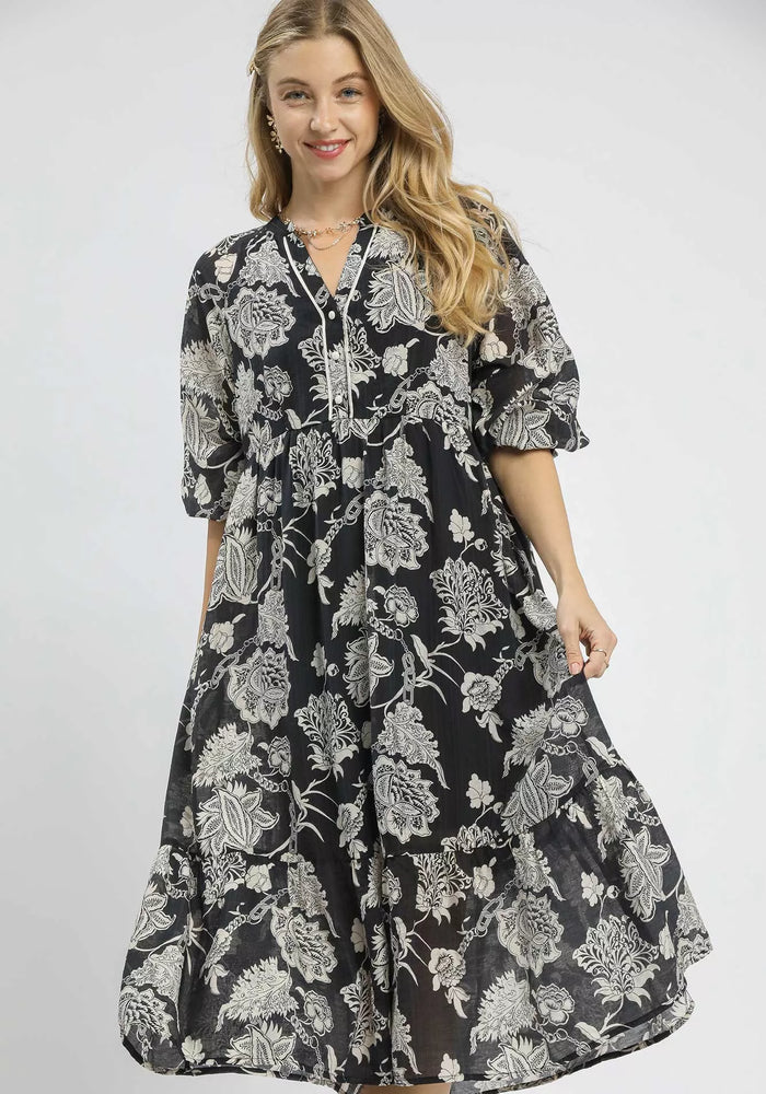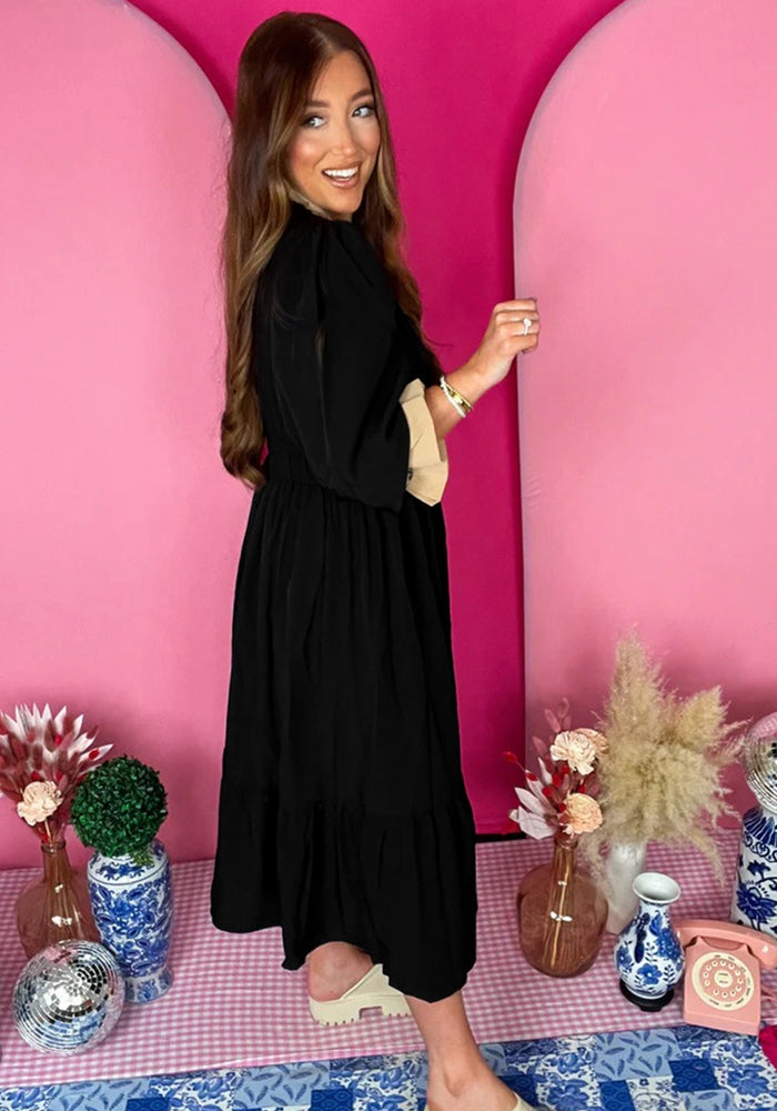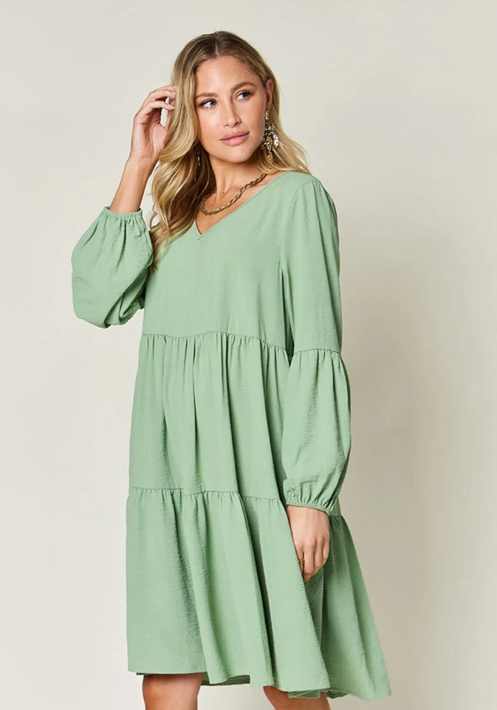 Double Take Full Size V-Neck Balloon Sleeve Tiered Dress with Pockets