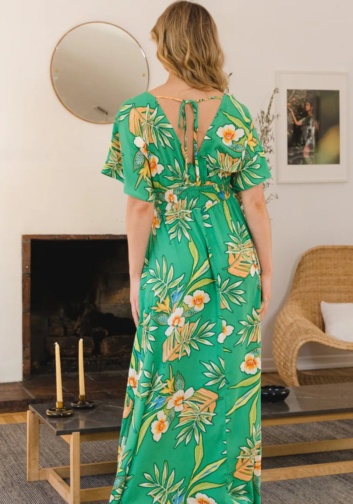 ODDI Full Size Floral Smocked Tied Back Maxi Dress