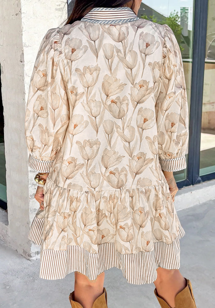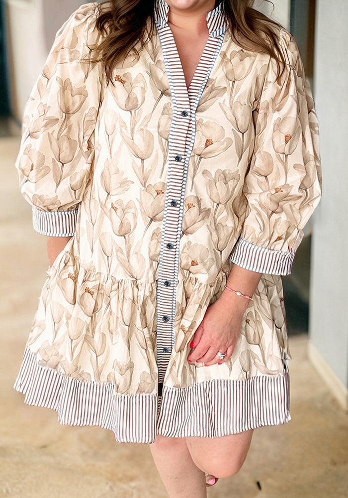 Khaki Plus Size Floral Print Striped Trim Patchwork Button Down A-line Dress