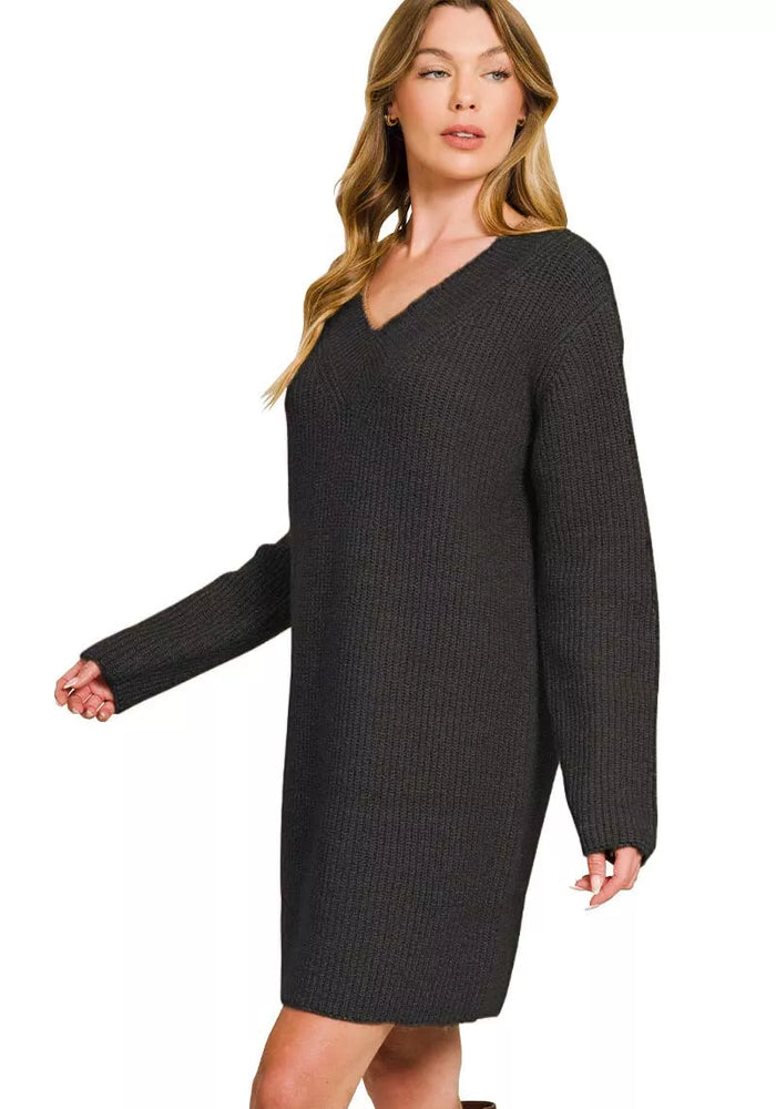 V-Neck Long Sleeve Ribbed Sweater Dress