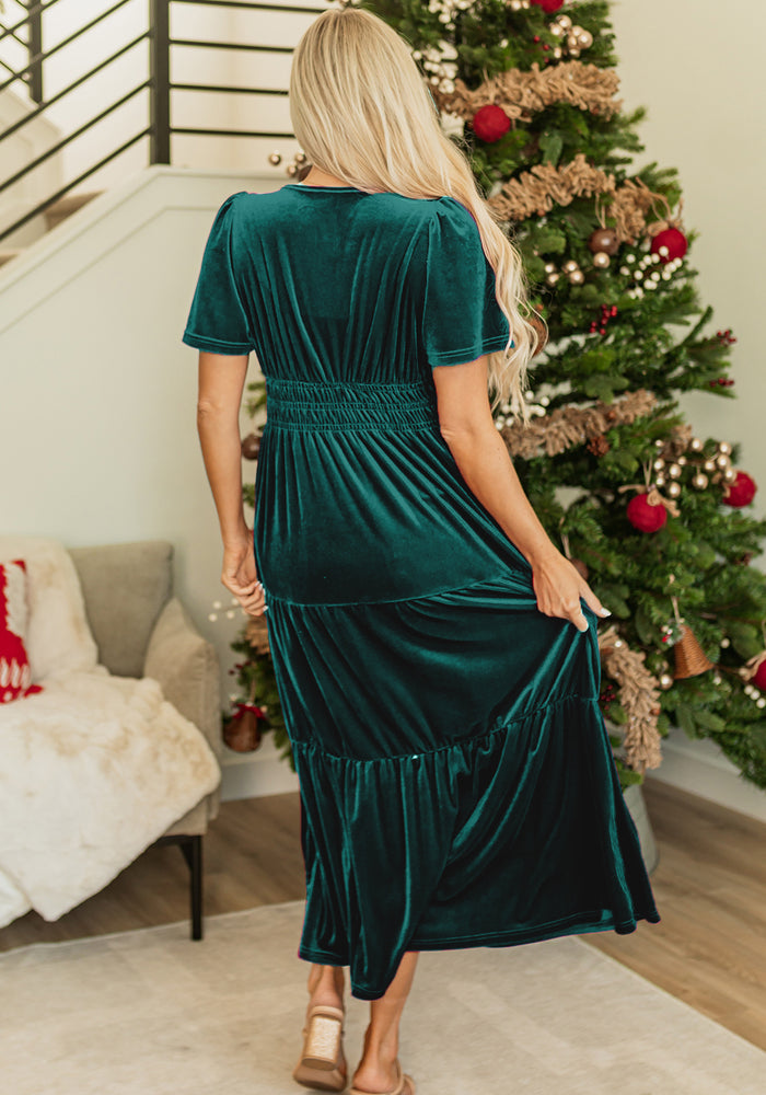 Evergreen Velvet Short Sleeve Shirred Waist Tiered Maxi Dress