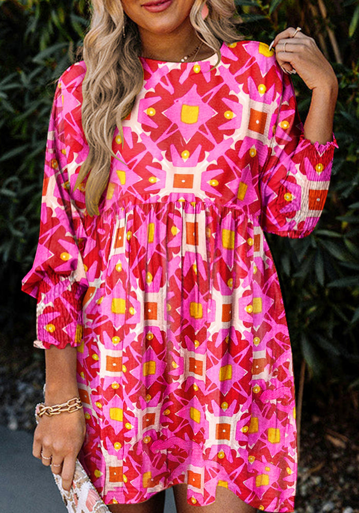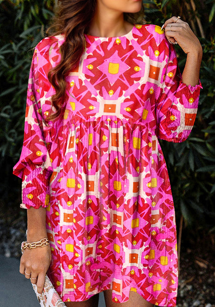 Strawberry Pink Geometric Print Smocked Long Sleeve Mini Dress