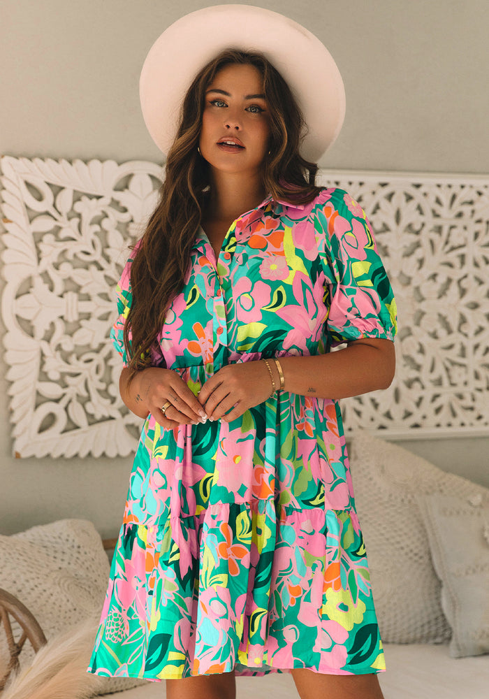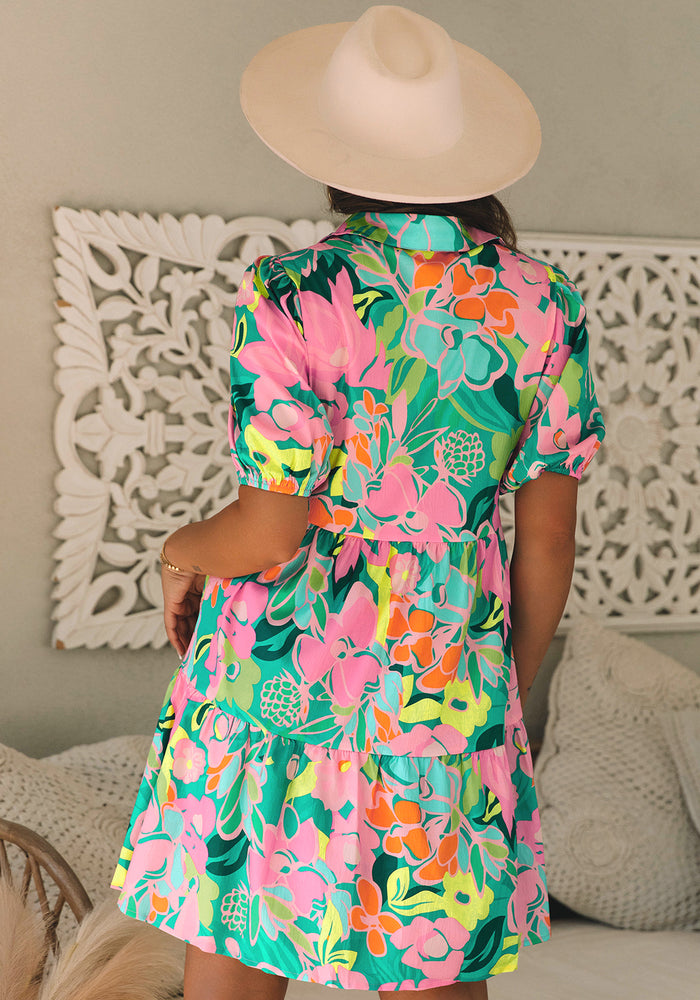 Green Floral Puff Sleeve Collar Buttoned Babydoll Dress