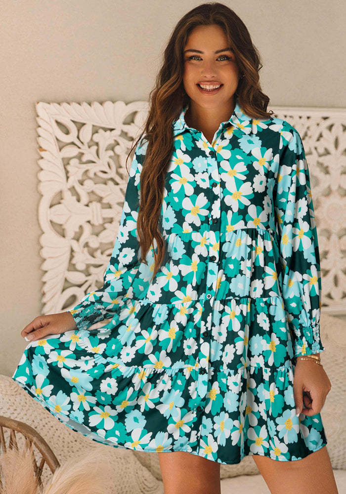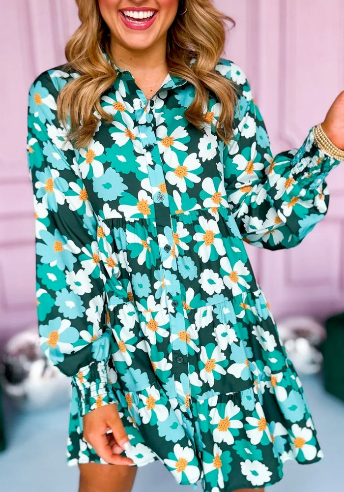 Green Floral Tiered Long Puff Sleeve Shirt Dress