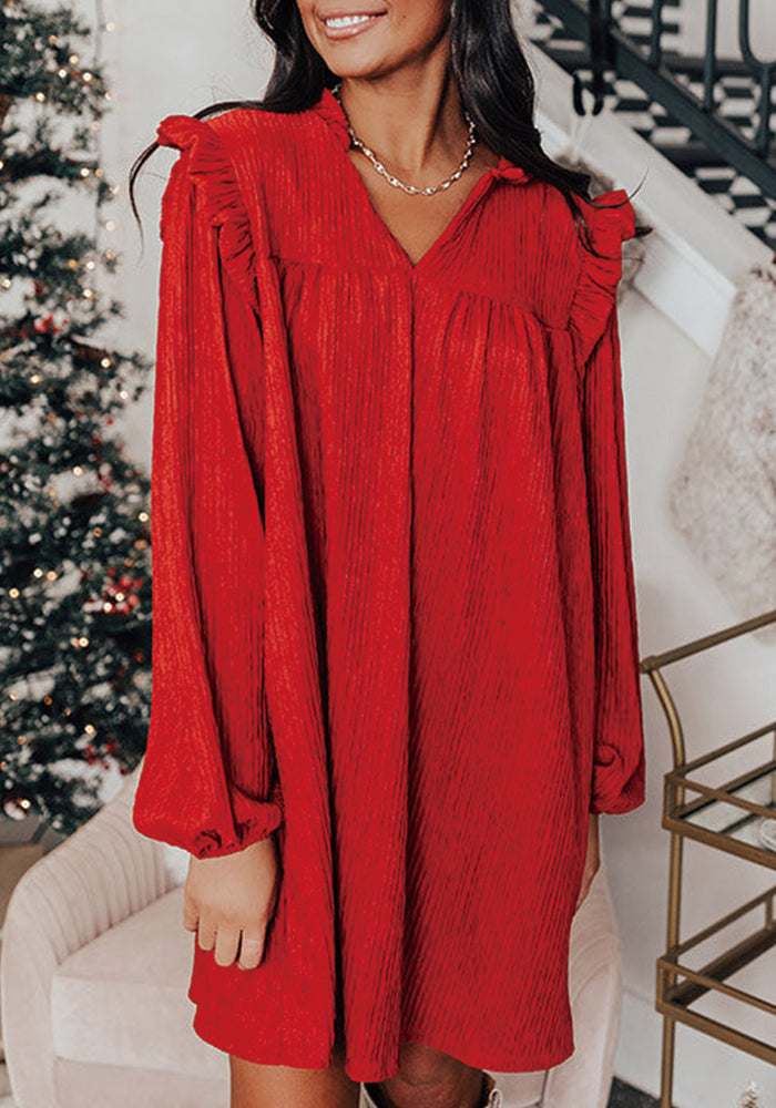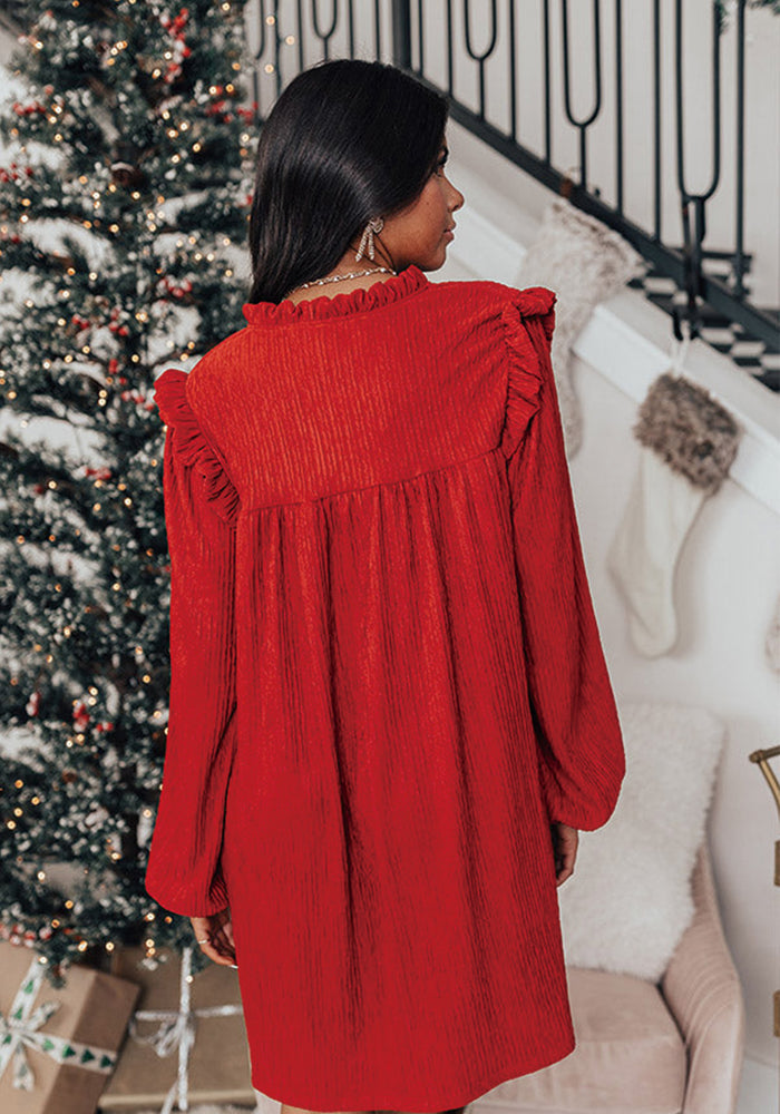 Fiery Red Textured Ruffled Trim V Neck Loose Fit Mini Dress